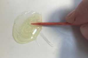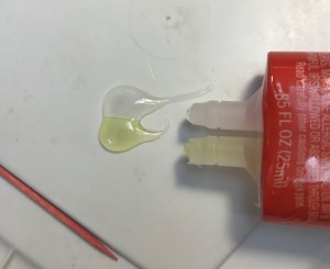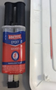 Epoxy glue comes in two separate tubes that you will mix just before use. Make sure to work in a well-ventilated area. Dispense two equal quantities and mix very thoroughly with a toothpick. Scrape the glue back into the center as necessary to make sure all of both components is included and well mixed.