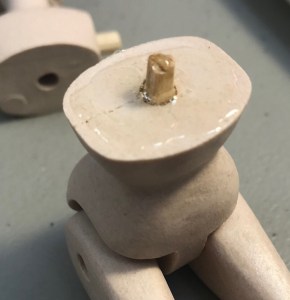 Fit the head down onto the lower body portion and line them up carefully. Use the arm pegs as a guide to be sure the head is on straight. Press the head firmly down onto the body. It’s ideal if the glue fills to the edge, though not strictly necessary, and a little may seep over the edge. It’s usually easiest to remove any drips or excess after drying.