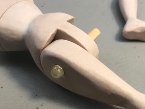 Use the body peg to scoop a large dollop of epoxy and set it firmly in the socket in the doll’s waist. Use a new, clean toothpick, (not the same one you used for mixing), to spread glue on the flat portion of the lower body, ending a little way from each edge, as shown.