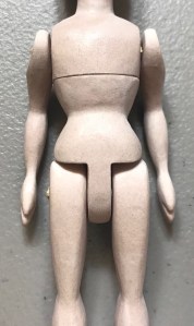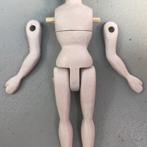 Lay the doll flat on her back to dry. Position the arms snugly against the body at the shoulder/peg joint, but position the hand a little distance away from the hip/leg, and make sure the spacing matches on either side. Allow the doll to dry at least an hour before handling.